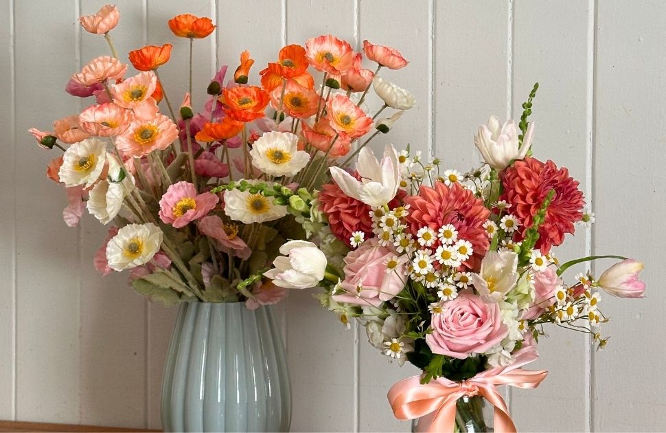 Faux flowers are great as you can get pretty much any kind and every colour. Maddie suggests floral like poppies, in a warm autumn colour palette.